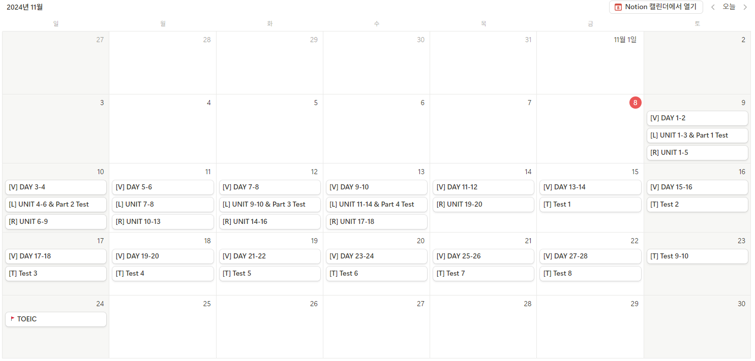 | 오블완 티스토리 챌린지와 함께 시작하는 토익 2주 챌린지 (목표: 700에서 900+) (7) | 2024.11.07 |